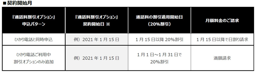 ※ひかり電話と同時申込の場合、『通話料割引オプション』の契約開始日はひかり電話の開通日となります。