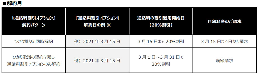 ※ひかり電話と同時解約の場合、『通話料割引オプション』の解約日は、ひかり電話の解約日と同日となります。