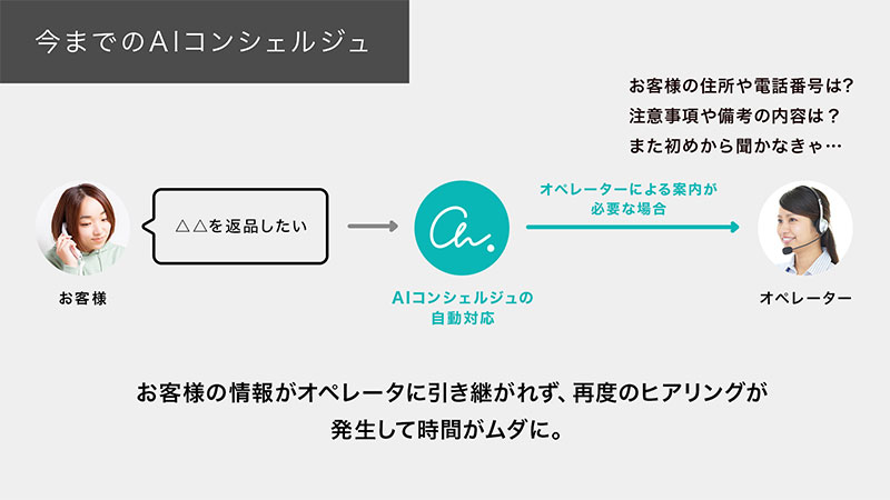 サービス提供の中で利用者様から「『AIコンシェルジュ®』からオペレーターに転送する際に、それまでの応対履歴をすべて引き継いでほしい」「オペレーターに代わった後にヒアリングをし直すのはお客さまの負担になる」といった声を多くいただきました。