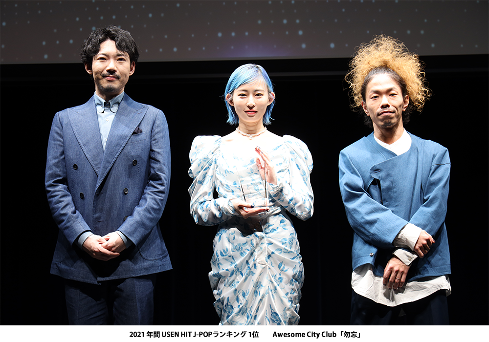 今年公開の映画主題歌としても話題の「勿忘」でJ-POPランキング 1位となったAwesome City Clubは、「幼い頃から身近な存在で、世代を問わずに聴かれているUSENのランキングで受賞できたことを嬉しく思います。」とコメント。また「今年は『勿忘』の楽曲を通して多くの方に知っていただけた年でした。来年はもっと知ってもらい愛していただける年にしたいです。」と今後の抱負を語りました。