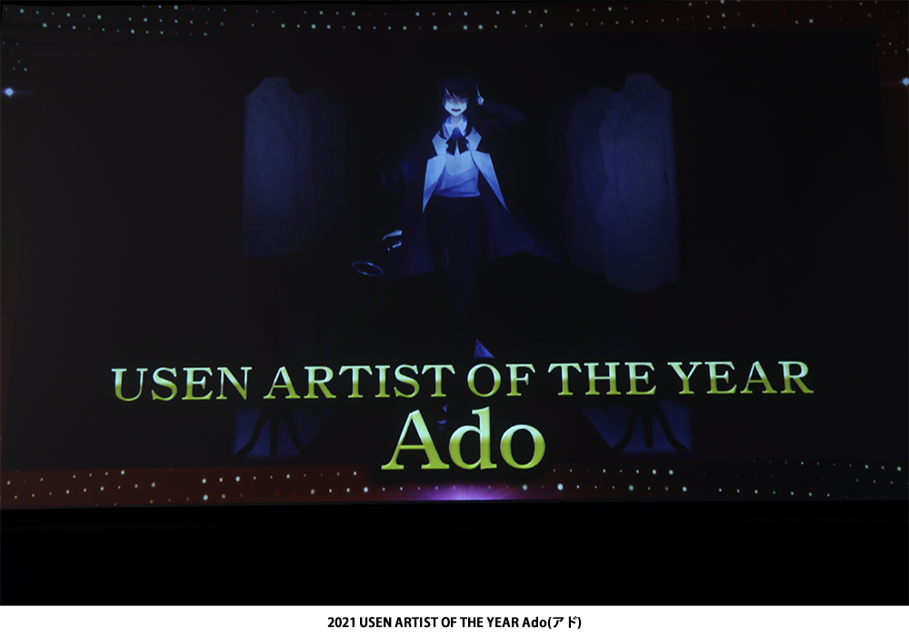 2021年に最も支持されたアーティストへ贈られる「2021 USEN ARTIST OF THE YEAR」に輝いたAdoは、音声出演でMCを務めた赤坂泰彦との掛け合いで感謝の気持ちを伝えました。受賞に際し、「自身でも理解が追い付かないほどに怒涛の一年でした。本当にたくさんの応援ありがとうございます。」とコメント。また来年Zepp DiverCityで開催予定の初ワンマンライブ『喜劇』についても触れ、「高校2年生のときに語った夢がついに叶うということで、あの時諦めたりしなくて良かったと思えるような特別なライブにしたい」と意気込みを語りました。