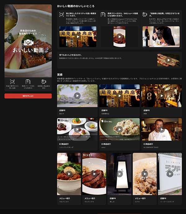 新サービス『おいしい動画』は、当社が運営する「ヒトサラ」の定めた品質基準をクリアしたプロカメラマンとプロの編集ディレクターによる動画制作サービスです。