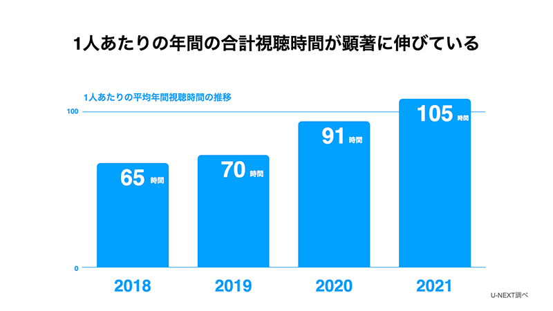 在宅時間の増加を受けて、視聴時間にも大きな変化が表れました。年間の平均視聴時間は、2019年→2020年で21時間(30%増)、2020年→2021年で14時間(15%増)増え、2021年は平均105時間に。コロナ以前の2019年と比較すると平均35時間増加しています。U-NEXTはラインナップが充実していることもあり、以前より映画ファンやアニメファンのような“ジャンルファン”が多く、他サービスに比べて視聴時間が長い傾向にありますが、在宅時間が増えたことで、さらに視聴時間が増えているようです。