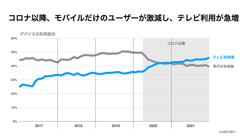 またアフターコロナで在宅時間が減っていく中で、ユーザー心理の変化も市場を大きく左右されると考えられています。さまざまな外的要因はあるものの、U-NEXTは変わらず圧倒的なカバレッジを取り揃えつつ、「ここでしか観られない」作品や、「ここでしか得られない体験」をご用意してまいります。また、ユーザー動向をもとに変化するエンタメライフをとらえ、さらにお客様に満足いただけるサービスの実現に取り組んでまいります。ぜひご期待ください。