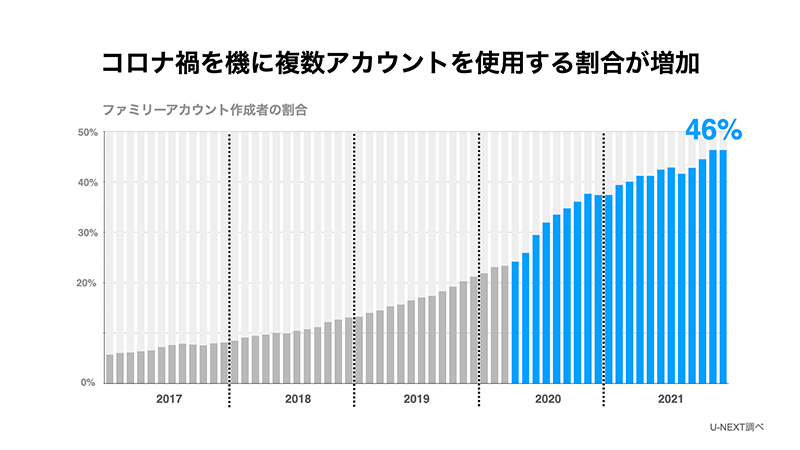 複数デバイスの利用が急増したことで、1契約で最大4つまでアカウントを作成することができる「ファミリーアカウント」の利用者割合も増加に転じました。家族でそれぞれに使い分けたい、視聴履歴やレコメンドを“自分専用”に設定したい、子ども用にペアレンタルロックのかかったアカウントを使用したい、等の理由から、在宅時間が増えた2020年5月頃から利用者割合が増加し、2021年末時点では46%が利用、平均1.52アカウントが活用されています。