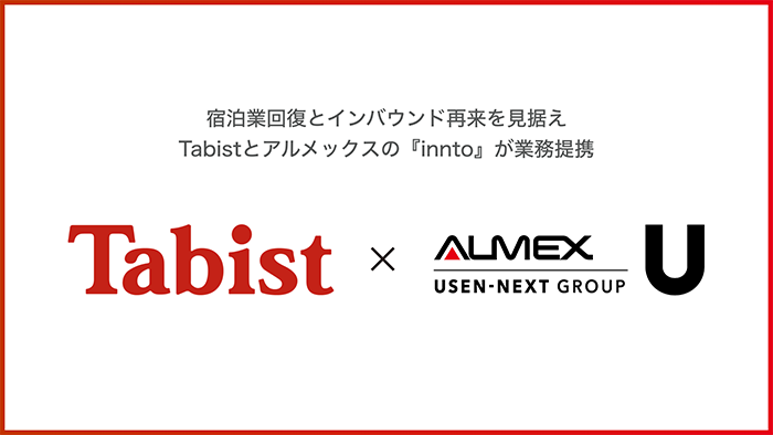 Tabist株式会社(本社:東京都港区、代表取締役社長 兼CEO:田野崎 亮太、以下:Tabist - タビスト)と、株式会社USEN-NEXT HOLDINGS(本社:東京都品川区、代表取締役社長CEO:宇野 康秀)のグループ会社である株式会社アルメックス(本社:東京都品川区、代表取締役社長:馬淵 将平、以下:アルメックス)は、2月28日付でinnto業務提携契約を締結しました。これにより、Tabistが支援する全国およそ230施設7,000室以上(※)に宿泊管理システム『innto(イントゥ)』を提供し、ホテル業務におけるオペレーションの効率化・最適化・自動化の実現をサポートします。