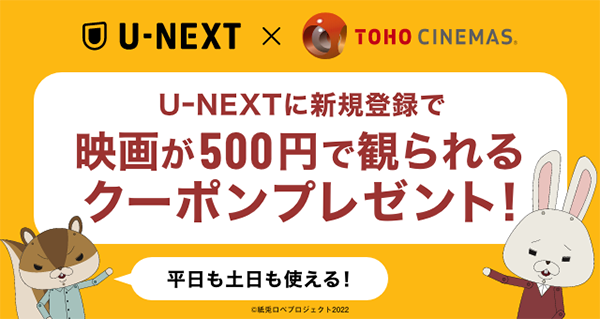 連携開始と同日の2022年4月1日(金)から、全国で展開するTOHOシネマズにて「U-NEXT×TOHOシネマズ」のコラボキャンペーンもスタートしました。特定ページからU-NEXTの「31日間無料トライアル」に新規登録した方を対象に「500円で映画が観られるクーポン」をもれなくプレゼント。