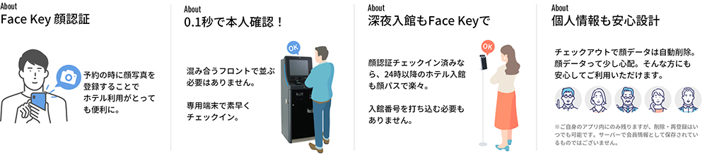 アプリで撮影された顔画像データはご自身のスマフォ内のみで存在。クラウド上でのインターフェイスは暗号化された特徴点データのみ画像再現は不可能となっています。C/Iで撮影されたデータも汎用性がない特殊機器で暗号化しており、チェックアウト日に完全消去。
