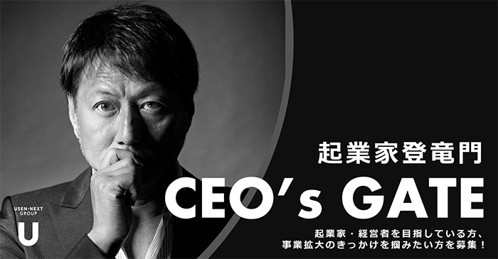 株式会社USEN-NEXT HOLDINGS(本社:東京都品川区、代表取締役社長CEO:宇野 康秀、以下、当社)は、起業家やスタートアップ経営者、または起業を目指している方のサポートプログラム“起業家登竜門 CEO's GATE”を実施することをお知らせします。それに伴い、“起業家登竜門CEO's GATE”について、当社代表の宇野より概要をお伝えするオンラインイベント映像を、2022年7月8日(金)に配信します。