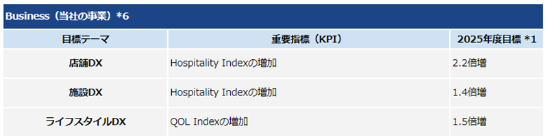 店舗DX・施設DXにおいては、「DX商材の提供拡大による社会への提供価値の拡大」をテーマに、独自に「Hospitality Index」という指標を策定。またライフスタイルDXにおいては、「ライフスタイルDXの提供拡大による社会への提供価値の拡大」をテーマに、独自に「QOL(Quality of Life) Index」という指標を策定しました。