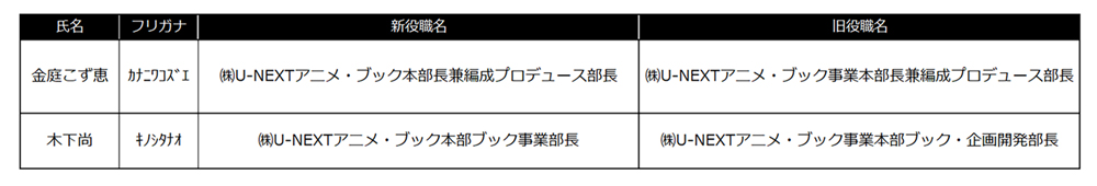 株式会社USEN-NEXT HOLDINGS(本社:東京都品川区、代表取締役社長CEO:宇野 康秀)は8月1日、グループ会社である株式会社U-NEXTの人事を決定しましたので、下記のとおりお知らせします。