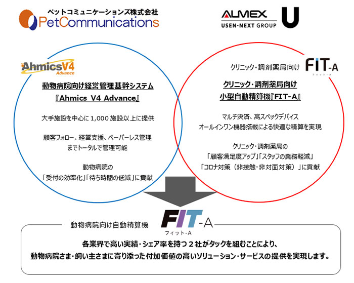 株式会社USEN-NEXT HOLDINGS(本社:東京都品川区、代表取締役社長CEO:宇野 康秀)のグループ会社である株式会社アルメックス(本社:東京都品川区、代表取締役社長:馬淵 将平、以下、アルメックス)とペットコミュニケーションズ株式会社(本社:大阪府大阪市中央区、代表取締役社長:南埜 紀雄、以下、ペットコミュニケーションズ)は、経営管理基幹システム『Ahmics V4 Advance(アーミックス V4 アドバンス)』と連携した自動精算機『FIT-A(フィット エー)』の提供を本日9月27日より開始しました。『FIT-A』は、動物病院における会計業務の効率化や窓口混雑緩和を目的に両社で共同開発を行い、動物病院向けにカスタマイズした自動精算機です。