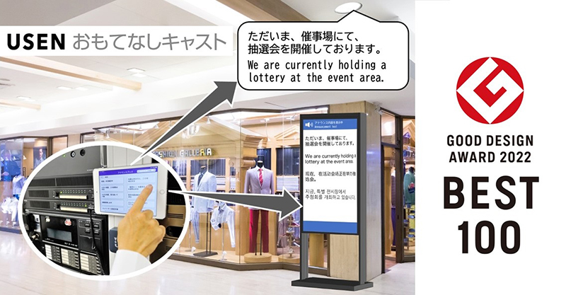 株式会社USEN-NEXT HOLDINGS(本社:東京都品川区、代表取締役社長CEO:宇野 康秀)のグループ会社である株式会社USEN(本社:東京都品川区、代表取締役社長:田村 公正、以下、当社)は、ヤマハ株式会社 と共同で取り組む業務用アナウンスシステム『音と文字で伝わる「SoundUD の多言語アナウンスシステム」』が、公益財団法人日本デザイン振興会が主催する「2022 年度グッドデザイン賞」を受賞しました。