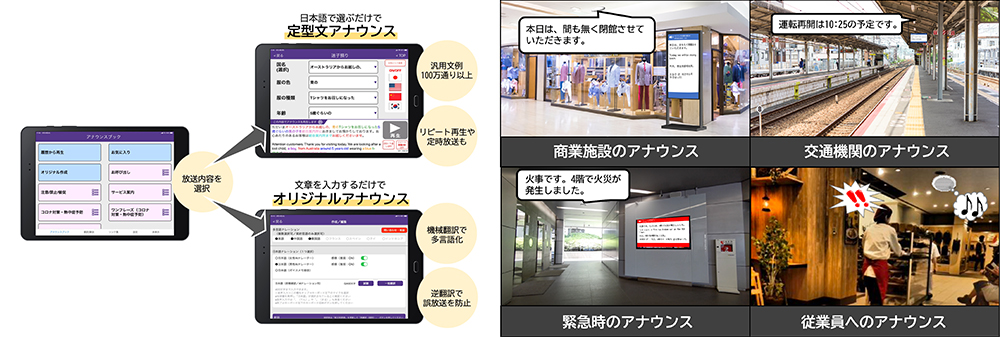さまざまな業種や状況に対応した汎用アナウンスがプリセットされており、流したいアナウンスをタブレット上で選ぶだけですぐに多言語のアナウンスを流すことができ、プリセットに無いアナウンスは逆翻訳機能付きの商用翻訳サービスと合わせて、オリジナルアナウンスの作成も可能です。音声に連動してアナウンス内容をサイネージに割り込み表示することも可能で、言語や聴覚に不安のある方など多様な方々に等しく情報を伝達できます。商業施設、交通機関などさまざまな施設で導入され、平時や災害時に活用されています。