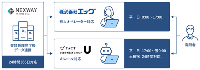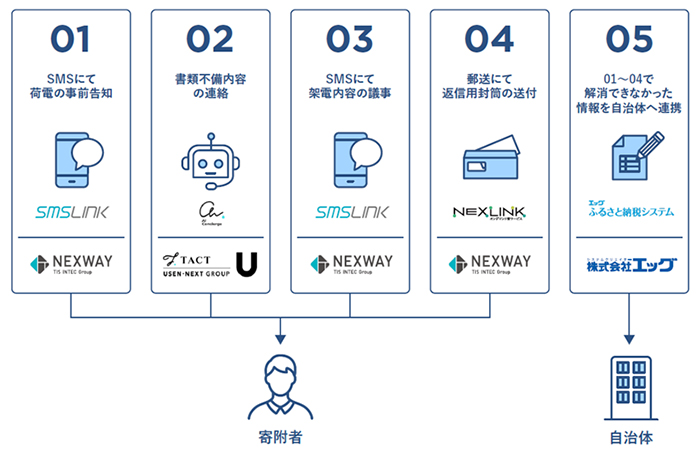 実証実験では、エッグの「ふるさと納税システム」に、ネクスウェイが提供するワンストップ郵送DMサービス「NEXLINKオンデマンド便サービス」やSMS配信サービス「SMSLINK」、TACTが提供する自治体向け音声自動応答サービス(AIコール)「AIコンシェルジュⓇ for LGWAN」を組み合わせることで、自治体の窓口対応時間を拡充し、業務負荷の軽減ができるかを検証します。