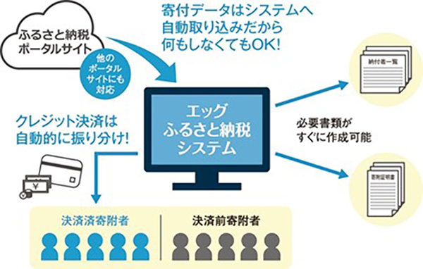 「ふるさと納税システム」は、寄附者情報や返礼品の管理、各種関連書類の作成等を、自治体職員様が正確、簡単に行うことができるシステムです。