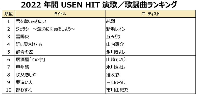2022 年間 USEN HIT 演歌/歌謡曲ランキング