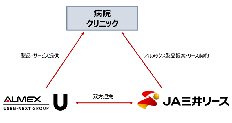 株式会社USEN-NEXT HOLDINGS(本社:東京都品川区、代表取締役社長CEO:宇野 康秀)のグループ会社である株式会社アルメックス(本社:東京都品川区、代表取締役社長:馬淵 将平、以下、アルメックス)とJA三井リース株式会社(本社:東京都中央区、代表取締役 社長執行役員:新分 敬人、以下、JA三井リース)は、病院・クリニックのDX化支援に関して協業を開始したことをお知らせします。