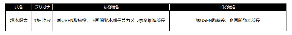 株式会社USEN-NEXT HOLDINGS(本社:東京都品川区、代表取締役社長CEO:宇野 康秀)は、本日2月1日、グループ会社である株式会社USENの人事を決定しましたので、下記のとおりお知らせします。