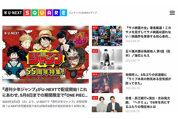 株式会社USEN-NEXT HOLDINGS(本社:東京都品川区、代表取締役社長CEO:宇野 康秀)のグループ会社である株式会社U-NEXT(本社:東京都品川区、代表取締役社長:堤 天心)は、2023年4月19日(水)、コンテンツLOVERに向けたWebメディア「U-NEXT SQUARE(ユーネクスト スクエア)」を立ち上げました。
