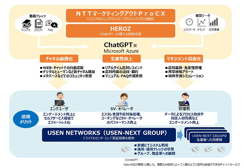 株式会社NTTマーケティングアクトProCX(本社:大阪市都島区、代表取締役社長:室林 明子、以下、NTTマーケティングアクトProCX)とHEROZ株式会社(本社:東京都港区、代表取締役:林 隆弘・髙橋 知裕、以下、HEROZ)および株式会社USEN-NEXT HOLDINGS(本社:東京都品川区、代表取締役社長CEO:宇野 康秀、以下、USEN-NEXT HOLDINGS)は、コンタクトセンターにおける「Azure OpenAI Service*1」を使用しカスタマイズされた『ChatGPT*2』を活用した顧客接点の高度化や問い合わせ対応中・対応後の従事者アシスタントによる業務の効率化、業務量予測などのマネジメントの自動化に向けたプロジェクトを始動しました。この取り組みにより、CXコンサルティングノウハウを持つNTTマーケティングアクトProCX、AI技術を提供するHEROZ、コンテンツ配信事業や店舗サービス事業、通信事業などを展開し、各事業のコンタクトセンタ―を運用するUSEN-NEXT GROUPのそれぞれの強みを生かし、生成AIを活用した事業運営モデルを共同で開発し、本格導入することにより、コンタクトセンターの生産性向上だけでなく、運営サポートで従業員体験(EX)を高め、顧客体験(CX)のさらなるシームレスな向上をめざします。