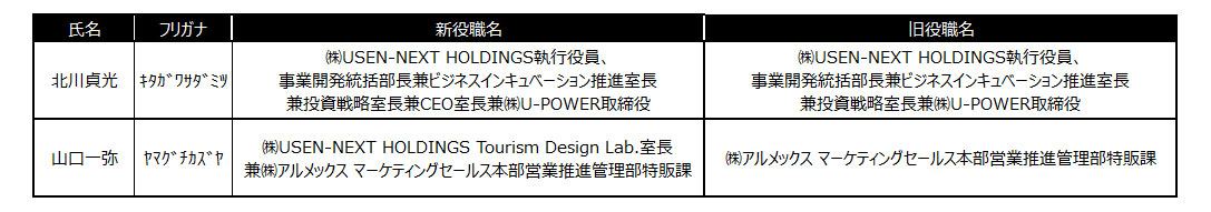 株式会社USEN-NEXT HOLDINGS(本社:東京都品川区、代表取締役社長CEO:宇野 康秀、以下、当社)は、本日5月1日、当社の人事を決定しましたので、下記のとおりお知らせします。