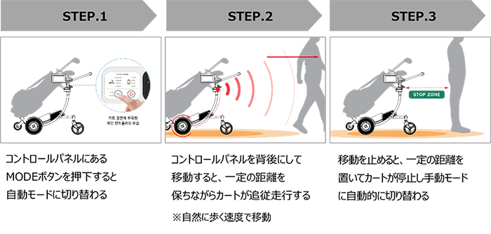 プレイヤーに追従走行、ゴルフカートに代わる新体験!