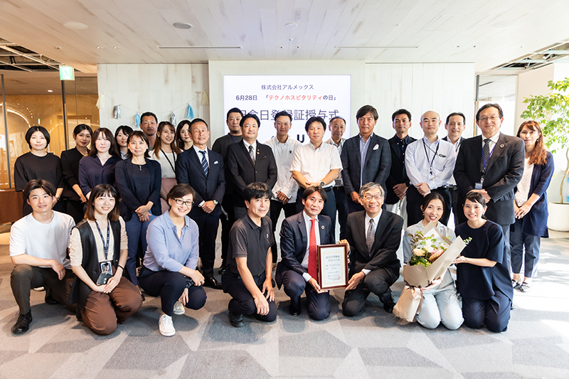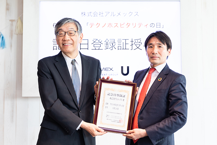 株式会社USEN-NEXT HOLDINGS(本社:東京都品川区、代表取締役社長CEO:宇野 康秀)のグループ会社である株式会社アルメックス(本社:東京都品川区、代表取締役社長:馬淵 将平、以下、当社)は、6月28日を『テクノホスピタリティの日』として、一般社団法人日本記念日協会(本部:長野県佐久市、代表理事:加瀬 清志、以下、日本記念日協会)より、正式に記念日登録認定されました。同日、当社目黒本社にて「記念日登録書」の授与式も開催しました。