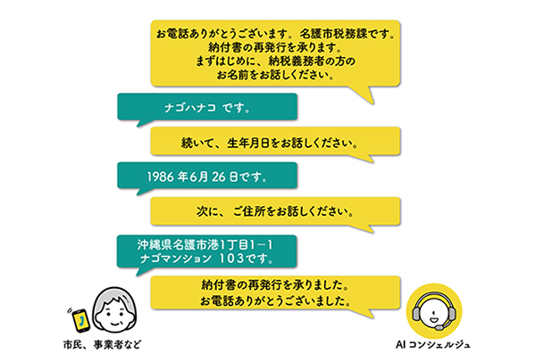 沖縄県名護市(市長:渡具知 武豊、以下、名護市)とOTNet株式会社(本社:沖縄県那覇市、代表取締役社長:山森 誠司、以下、OTNet)および株式会社USEN-NEXT HOLDINGS(本社:東京都品川区、代表取締役社長CEO:宇野 康秀)のグループ会社である株式会社TACT(本店:東京都品川区、代表取締役社長:溝辺 和広、以下、TACT)は、各種税金に未納がある市民や事業者からの「税金納付書再発行依頼業務」に対して、TACTのAI(人工知能)による自治体向け電話自動応答システム『AIコンシェルジュ® for LGWAN』を用いた実証実験を2023年6月26日(月)より実施することをお知らせします。LGWAN*1に接続した電話自動応答でのご案内は、沖縄県初*2の取り組みとなります。