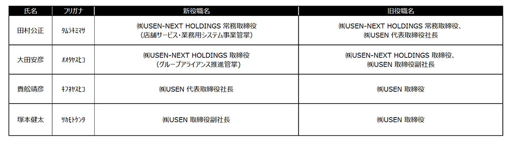 株式会社USEN-NEXT HOLDINGS(本社:東京都品川区、代表取締役社長CEO:宇野 康秀)は、グループ会社である株式会社USENの、2023年9月1日付における代表取締役社長等の人事について決定しましたので、下記のとおりお知らせします。