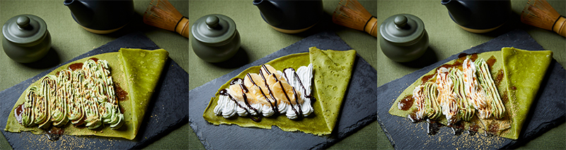 (写真左から:黒糖きな粉 抹茶ホイップ、バナナチョコ ホイップ、2種のクリーム入りスペシャルクレープ)