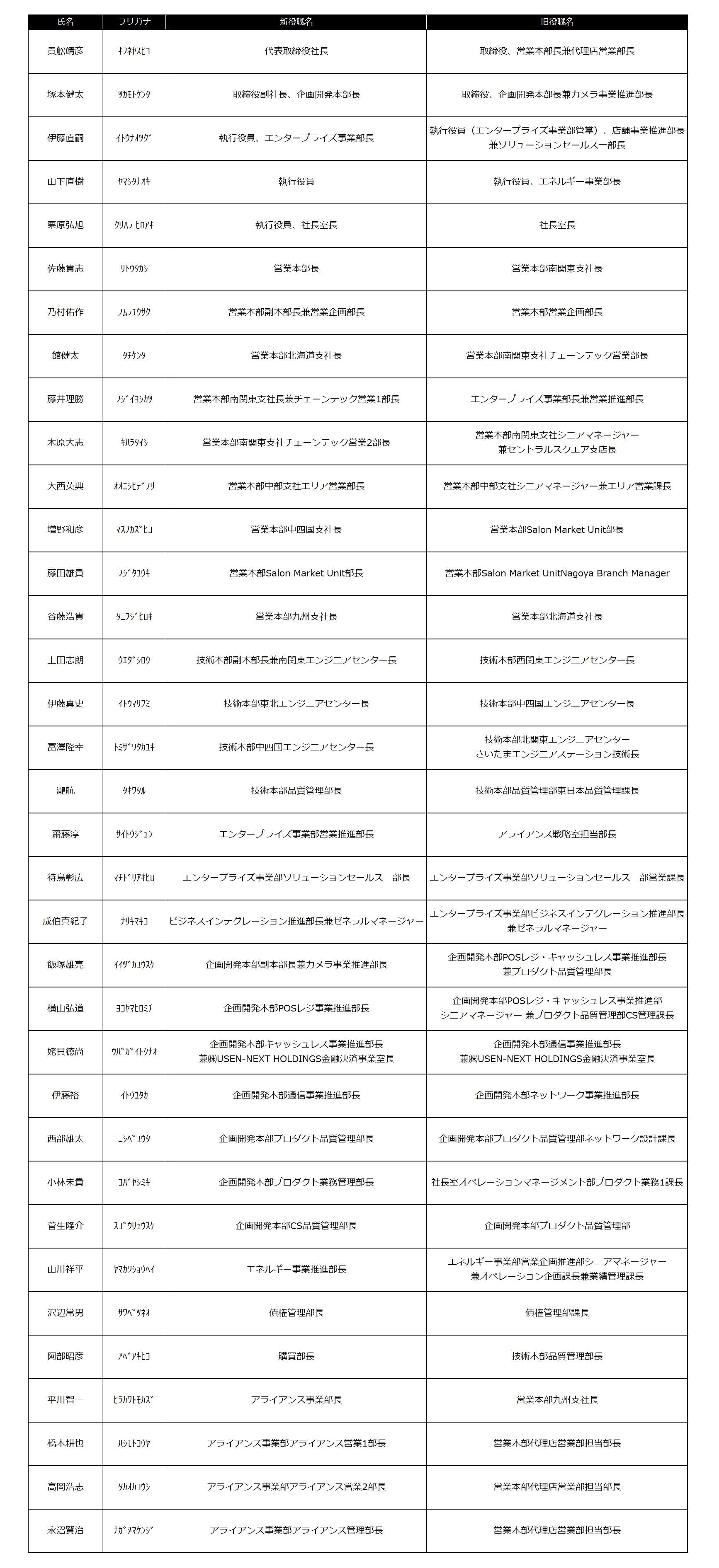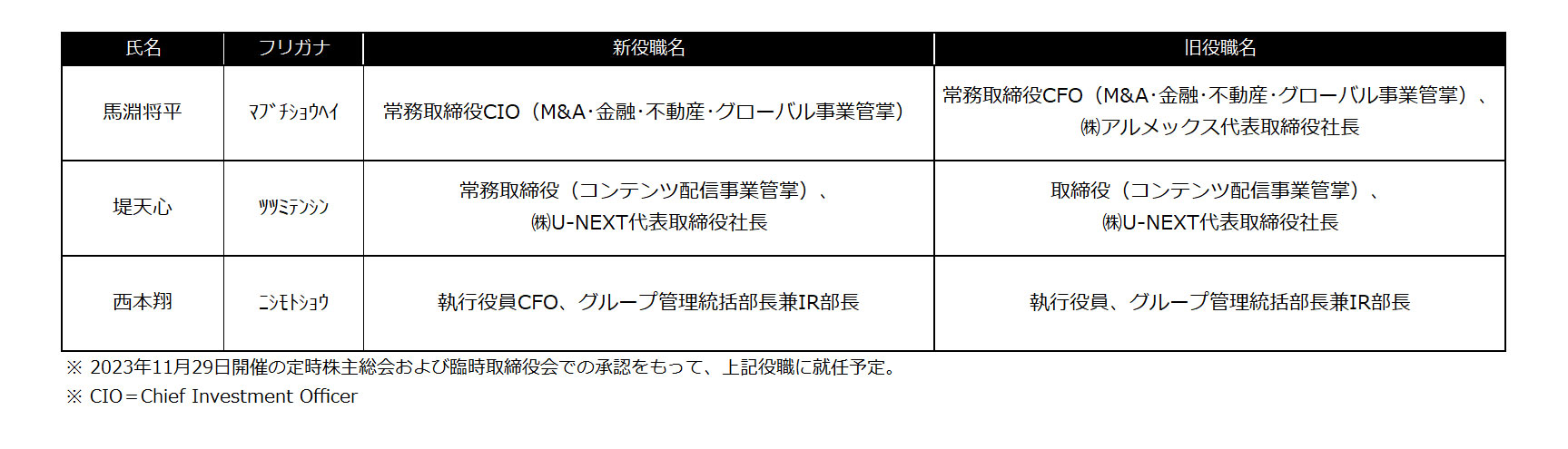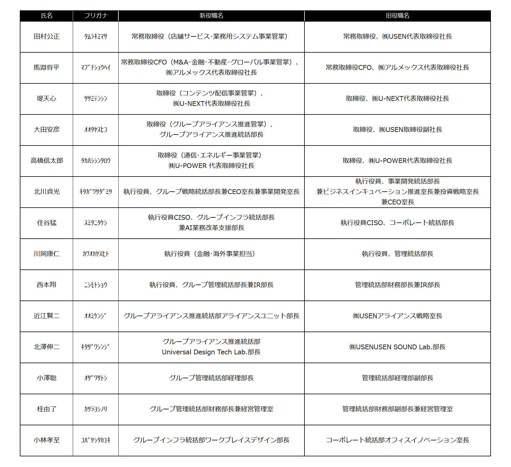 株式会社USEN-NEXT HOLDINGS(本社:東京都品川区、代表取締役社長CEO:宇野 康秀)は、2023年9月1日付および11月29日付における、当社とグループ会社である株式会社USENおよび株式会社U-NEXTの人事を決定しましたので、下記のとおりお知らせします。