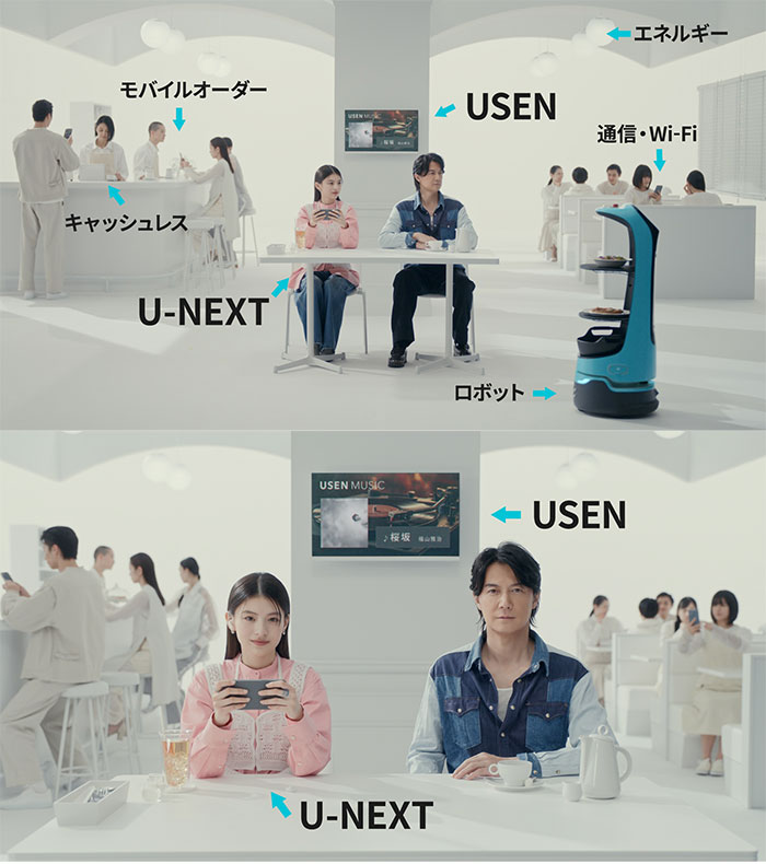 素敵なカフェで「USEN MUSIC」から聞こえてくるのは福山さんの『桜坂 2024※』。一方同じ空間でスマホを見ている出口さんの手元には「U-NEXT」に映る福山さん出演のドラマや映画が。そしてそのカフェで使われているモバイルオーダー、キャッシュレス、エネルギー、通信・Wi-Fi、ロボットまで…実は「これ、全部やってます!」。最後のお2人の驚きのカットも見どころです。