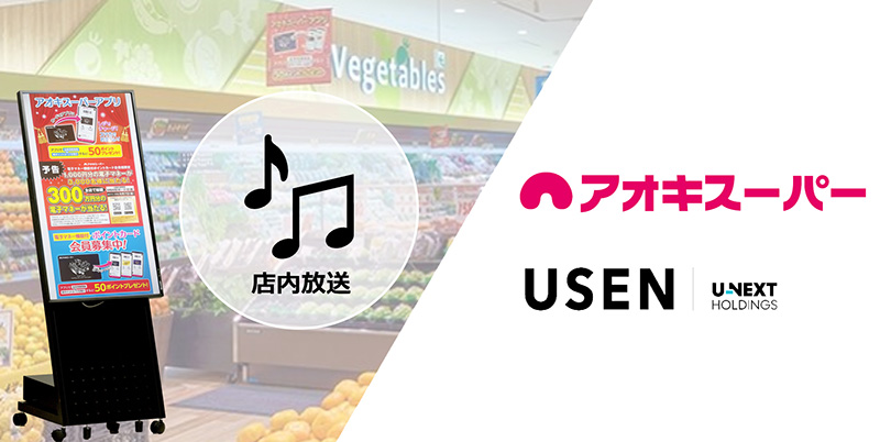 株式会社U-NEXT HOLDINGS(本社:東京都品川区、代表取締役社長CEO:宇野 康秀)のグループ会社である株式会社USEN(本社:東京都品川区、代表取締役社長:貴舩 靖彦、以下、USEN)と株式会社アオキスーパー(本社:愛知県名古屋市、代表取締役社長:青木 俊道、以下、アオキスーパー)は、アオキスーパーが運営する愛知県内全51店舗において、USENが60年以上店舗BGMを提供してきた“空間づくり”の知見を生かした『チェーン店向けBGMサービス』と『デジタルサイネージ』を“音×映像”で組み合わせ、店内放送を開始したことをお知らせします。