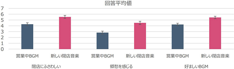①「新しい閉店音楽」の方が、営業中のBGMよりも「閉店にふさわしい」「郷愁を感じる」「好ましいBGM」の項目が有意に高くなることが示されました。