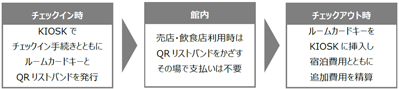 導入ポイント:今回の導入では、『KIOSK』にてチェックイン手続きを行う際、ルームカードキーの発行に加えQRリストバンドの発行と夕朝食時間の選択、ホテルの館内インフォメーションを表示する機能を追加しました。