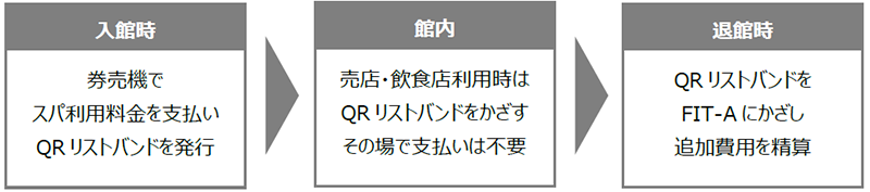 導入ポイント:今回の導入では、スパ利用者で追加費用が発生した場合、退館時QRリストバンドを『FIT-A』にかざして精算します※2。決済は現金、クレジットカード、QRコードに対応しています。