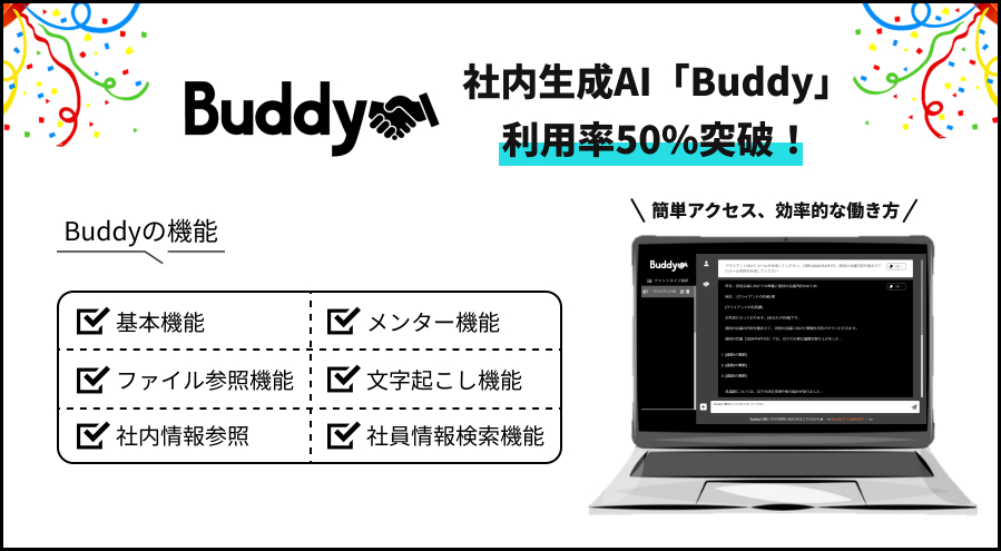 2023年11月の全社展開以降、「AI業務改革支援部」により「Buddy」の利用率向上に向け様々な取り組みを行った結果、約9か月での利用率が50%突破となりました。