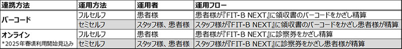 バーコード:バーコードを利用し会計情報のみを『FIT-B NEXT』に連携。クリニックは比較的安価に導入可能。
