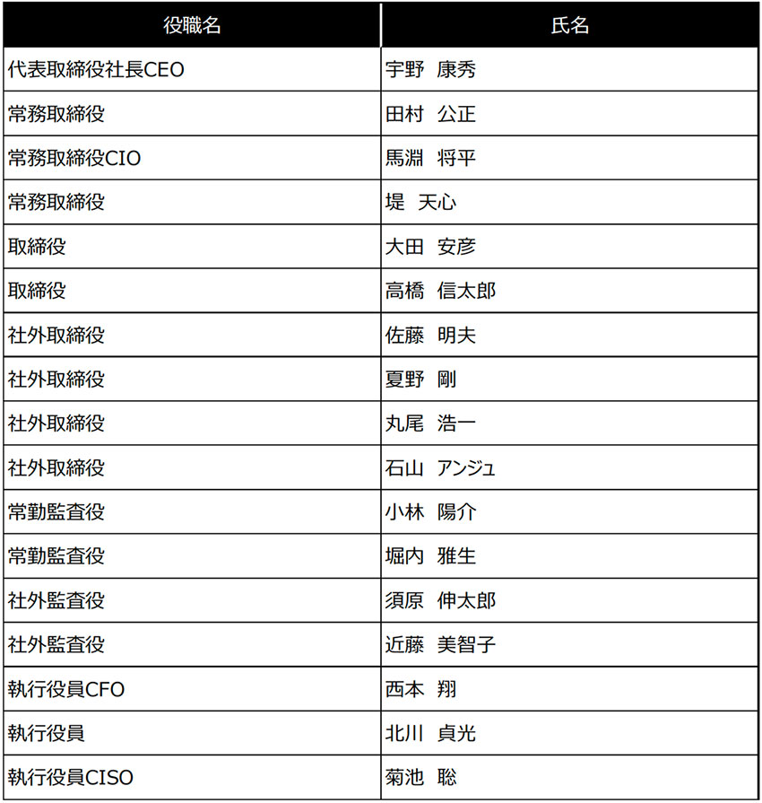 株式会社U-NEXT HOLDINGS(本社:東京都品川区、代表取締役社長CEO:宇野 康秀)は、本日11月28日開催の第17回定時株主総会および取締役会の決議により、新役員体制を決定しましたので、下記のとおりお知らせします。