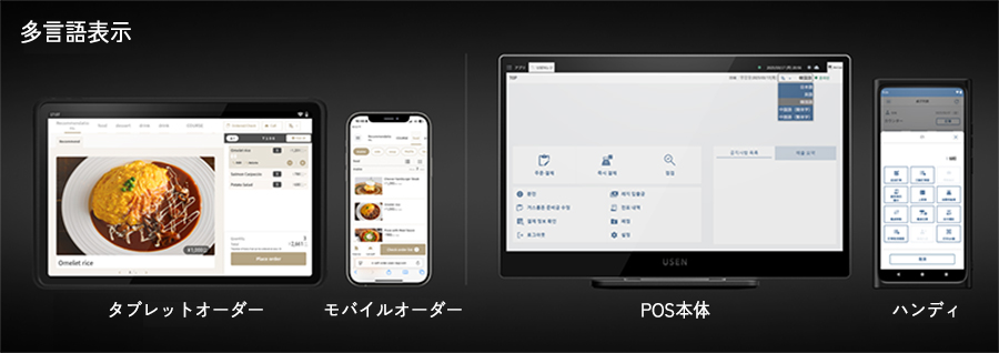 ・注文受付メニューの多言語に対応したハンディ端末に加え、会計や後続処理を行うPOS本体の操作画面も多言語対応を標準化