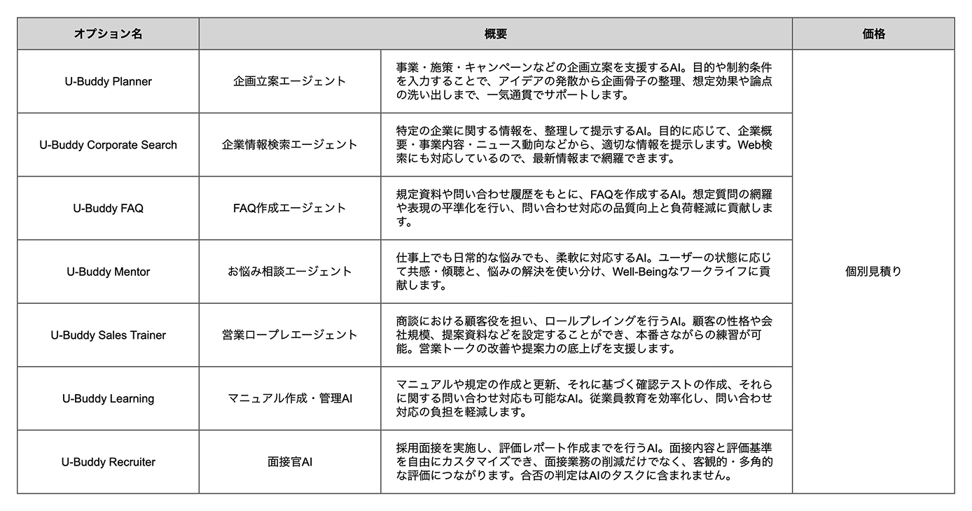 また、企画立案、企業情報検索、FAQ作成、営業ロールプレイングなど、業務や業種に応じた特化型ツール「U-Buddyエージェント」をオプションとして提供し、今後もラインアップの拡充を進めていきます。