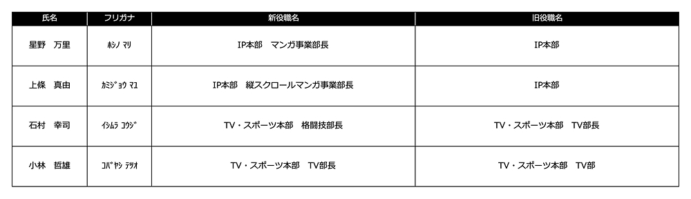 株式会社U-NEXT HOLDINGS(本社:東京都品川区、代表取締役社長CEO:宇野 康秀)は、4月1日付における、グループ会社である株式会社U-NEXTの人事を決定しましたので、下記のとおりお知らせします。